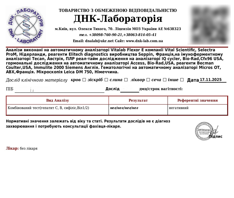 Translation: HIV, hepatitis, syphilis negative (17.11.2025)