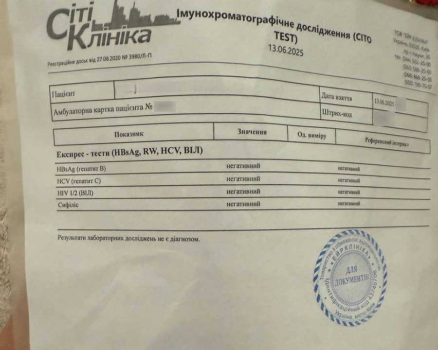 Translation: HIV, hepatitis, syphilis negative (13.06.2025)